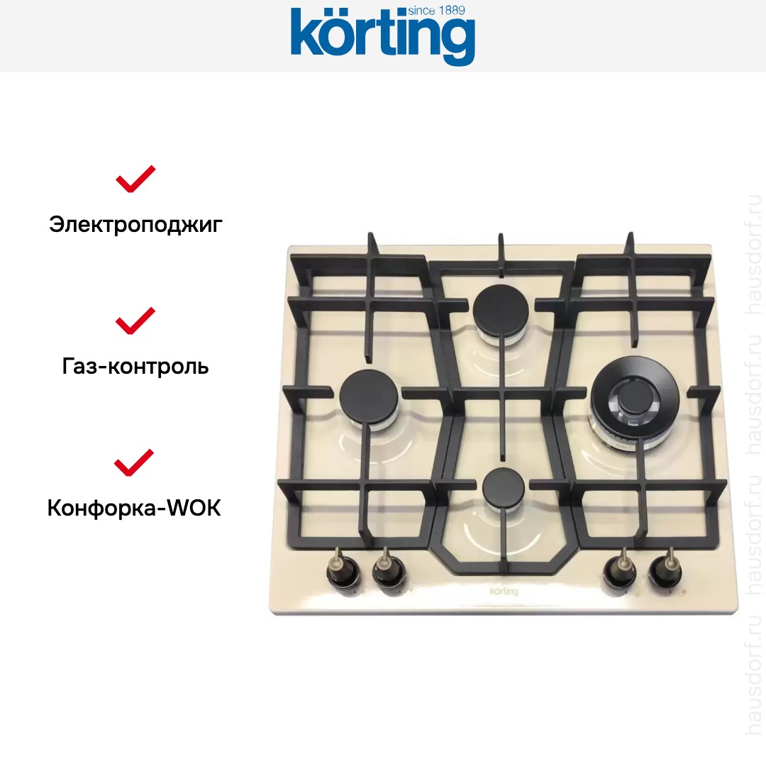 В правой части находится сверхмощная WOK-конфорка, позволяющая быстро кипятить воду или обжаривать продукты при высоких температурах. Блюда азиатской кухни в посуде с выпуклым дном готовятся на этой конфорке на специальной подставке. Использовать обычную посуду можно при готовке на остальных трех конфорках — двух средних мощностью 1,75 кВт и вспомогательной, которая подходит также для варки кофе или разогрева готовых блюд. Электроподжиг поможет зажечь горелку варочной панели Кортинг HG 631 CTRB одним поворотом рукоятки. Предотвратить утечки газа позволит система «Газ-контроль».