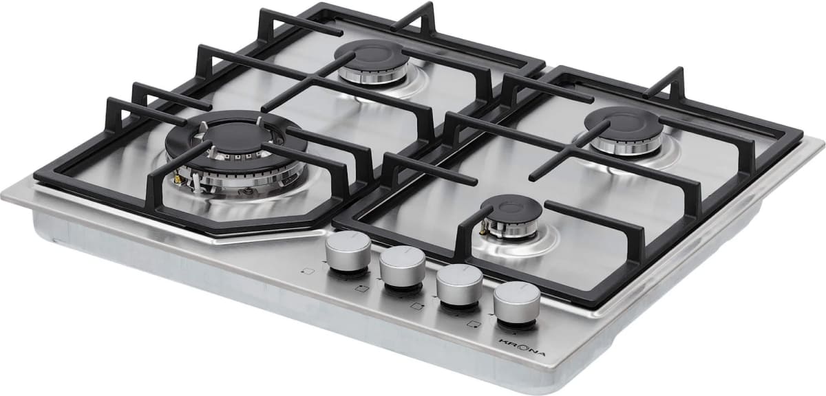 Выбор газовой варочной панели чаще всего обусловлен тем, что в частный дом или квартиру проведен именно газ в качестве обогрева. Работать с этой моделью довольно просто, так как мощность нагрева видна невооруженным взглядом — по силе огня в горелке. Количество конфорок в этой модели: 4. Горелки с тройной короной имеют несколько ступеней нагрева — в зависимости от них образуется несколько кругов пламени.