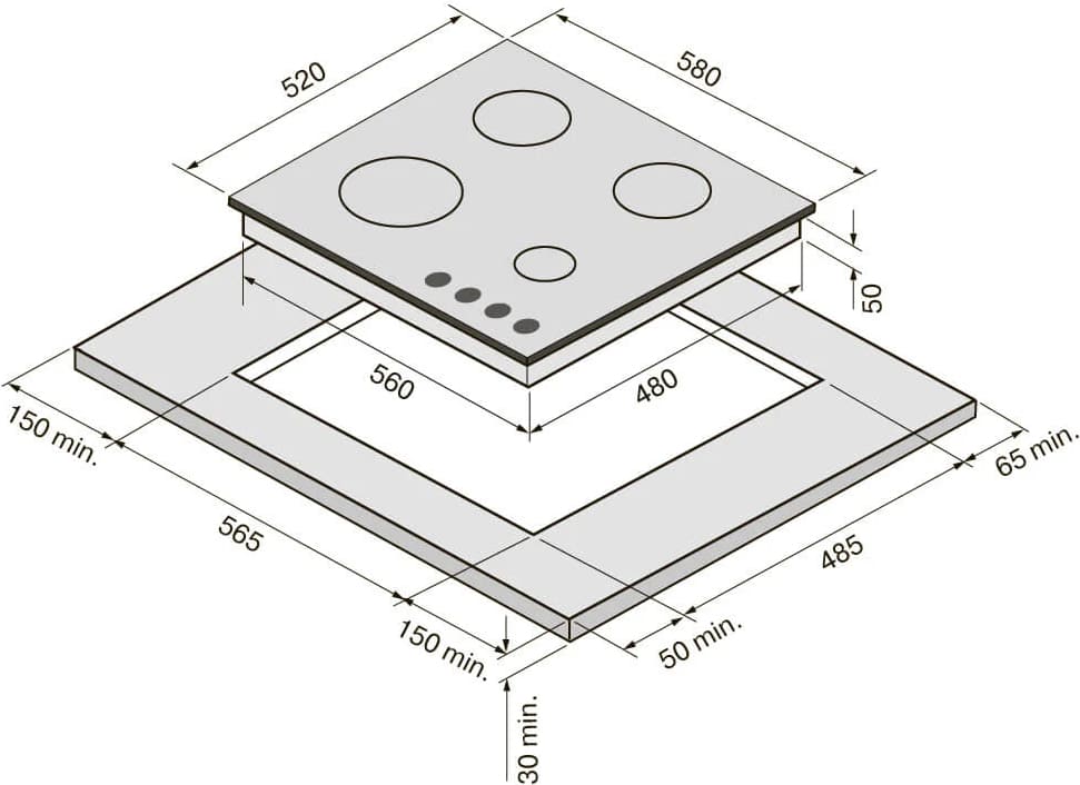 Отверстие в нише выполняют, исходя из размеров самой варочной панели — они должны соответствовать друг другу либо немного превышать размеры выреза. При выборе наиболее распространенной варочной панели с 4 конфорками в столешнице вырезается отверстие шириной 59 см и глубиной около 49-50 см. Толщина столешницы должна быть немного меньше, чем высота варочной панели, в противном случае панель придется заглубить, чтобы она не слишком выступала.