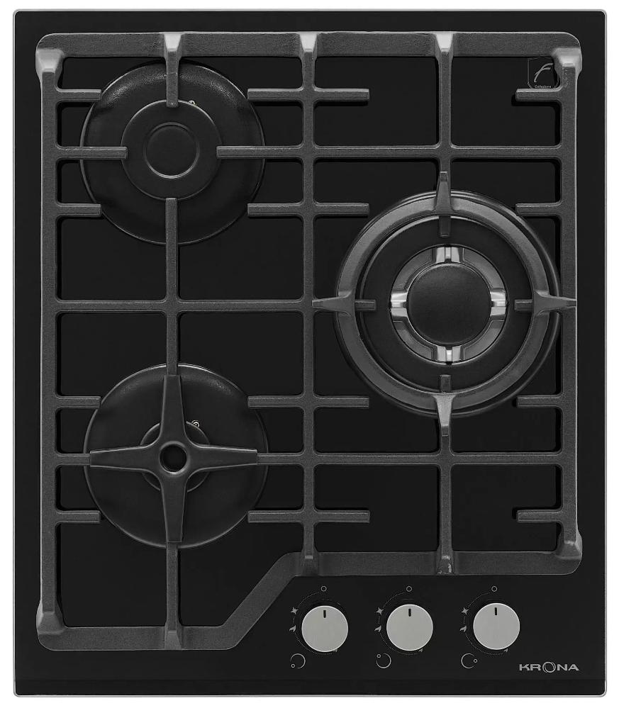 Выбор газовой варочной панели чаще всего обусловлен тем, что в частный дом или квартиру проведен именно газ в качестве обогрева. Работать с этой моделью довольно просто, так как мощность нагрева видна невооруженным взглядом — по силе огня в горелке. Количество конфорок в этой модели: 3.