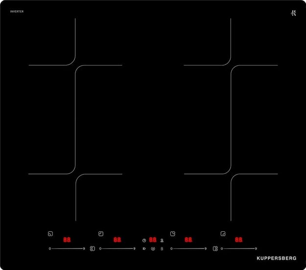 Варочная панель работает на индукционном нагреве — это значит, что повышается температура непосредственно посуды, в которой готовится блюдо. Таким образом промежуточная ступень с предварительным нагревом конфорки пропускается — сокращается время, повышается безопасность. Количество конфорок в этой модели: 4.