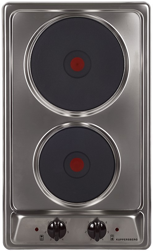 Kuppersberg FV3XE — узкая варочная панель в дизайне Domino. Модель снабжена двумя электрическими конфорками различной мощности и диаметра.