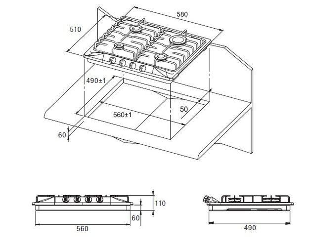 Отверстие в нише выполняют, исходя из размеров самой варочной панели — они должны соответствовать друг другу либо немного превышать размеры выреза. При выборе наиболее распространенной варочной панели с 4 конфорками в столешнице вырезается отверстие шириной 59 см и глубиной около 49-50 см. Толщина столешницы должна быть немного меньше, чем высота варочной панели, в противном случае панель придется заглубить, чтобы она не слишком выступала.