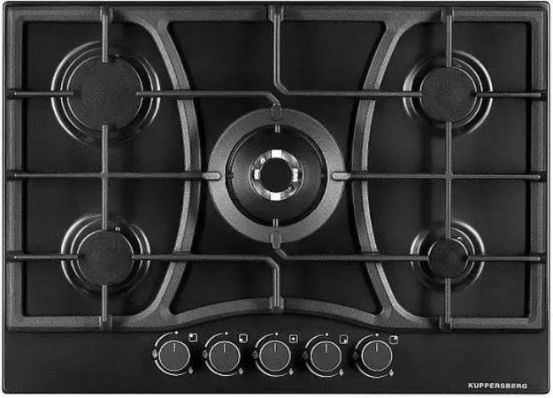 Выбор газовой варочной панели чаще всего обусловлен тем, что в частный дом или квартиру проведен именно газ в качестве обогрева. Работать с этой моделью довольно просто, так как мощность нагрева видна невооруженным взглядом — по силе огня в горелке. Количество конфорок в этой модели: 5.