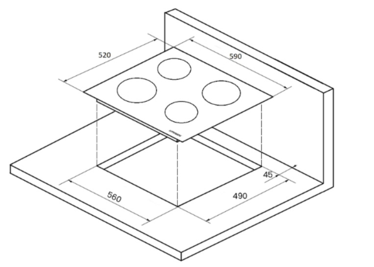 Отверстие в нише выполняют, исходя из размеров самой варочной панели — они должны соответствовать друг другу либо немного превышать размеры выреза. При выборе наиболее распространенной варочной панели с 4 конфорками в столешнице вырезается отверстие шириной 59 см и глубиной около 49-50 см. Толщина столешницы должна быть немного меньше, чем высота варочной панели, в противном случае панель придется заглубить, чтобы она не слишком выступала.