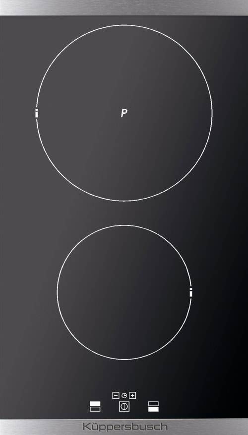 Kuppersbusch EKI 3720.1 ED — независимая индукционная варочная панель шириной 30 см и глубиной 52 см с двумя конфорками. Модель из серии Premium+ может встраиваться в кухонную тумбу в дизайне «Домино». Черная стеклокерамическая поверхность дополнена стальной рамкой, препятствующей вытеканию жидкости на столешницу. Индукционные конфорки оснащены функцией распознавания посуды — конфорка, на которой установлена кастрюля или сковорода, включается автоматически. Модель оснащена режимом временного увеличения мощности Power и автоматикой закипания. Сенсорные переключатели на панели управления позволяют регулировать мощность на 10 уровнях, они могут быть заблокированы для защиты от детей.