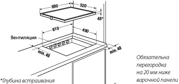 Отверстие в нише выполняют, исходя из размеров самой варочной панели — они должны соответствовать друг другу либо немного превышать размеры выреза. При выборе наиболее распространенной варочной панели с 4 конфорками в столешнице вырезается отверстие шириной 59 см и глубиной около 49-50 см. Толщина столешницы должна быть немного меньше, чем высота варочной панели, в противном случае панель придется заглубить, чтобы она не слишком выступала.