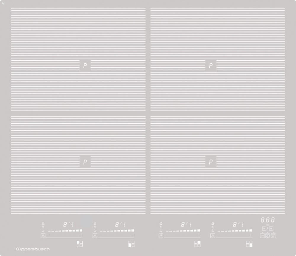 Индукционная панель Kuppersbusch имеет четыре зоны нагрева, которые можно объединить (есть автоматический режим). Благодаря этому вы можете использовать посуду любых размера и формы. Для каждой конфорки своя панель управления со слайдером.