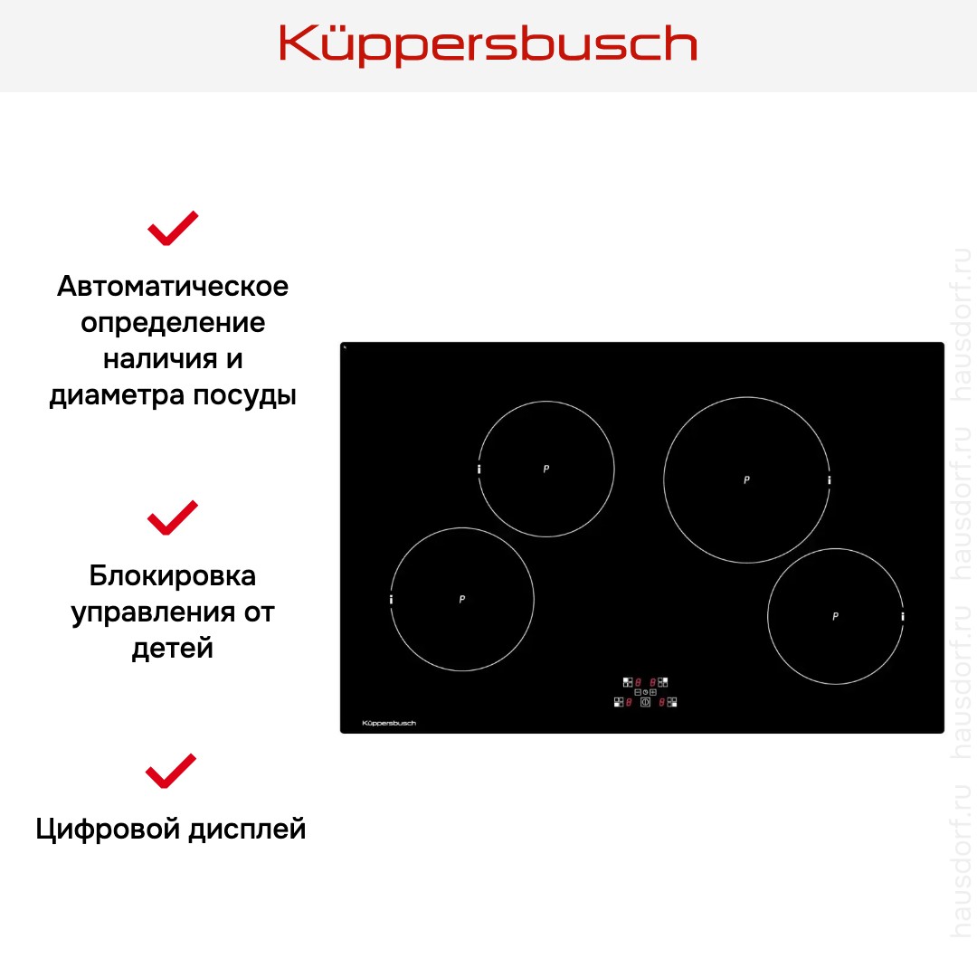 Индукционная панель Kuppersbusch со стеклокерамической поверхностью устанавливается вместе со стальной рамкой. Можно увеличить мощность в каждом варочной зоне благодаря режиму Power. Благодаря этому они разогреваются быстрее, повышается скорость приготовления.