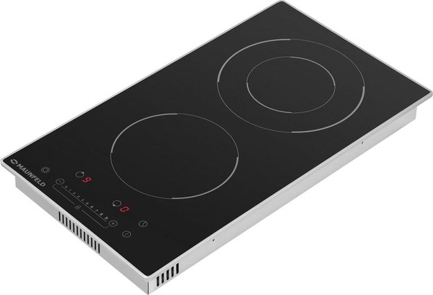 Maunfeld EVSE292FDBK — независимая электрическая варочная панель шириной 30 см с двумя зонами нагрева. Материал изготовления поверхности — стеклокерамика Vitro Ceramic Glass черного цвета, высокопрочная, способная выдержать самую тяжелую посуду — например, чугунные казаны и жаровни. Конфорки Hi-light от немецкого производителя EGO гарантируют очень быстрый нагрев, они мгновенно реагируют на команды, поданные с панели управления. По периметру варочной панели предусмотрена стальная рамка, которая защищает столешницу от попадания пролитой жидкости. Поверхность не имеет выступов и благодаря этому очень удобна в очистке: ее можно протереть одним движением, а для удаления более серьезных загрязнений рекомендуется использовать специальный скребок и средства для стеклокерамики. Благодаря небольшой ширине варочная панель может устанавливаться в малогабаритной кухне; она подойдет для студии, для тех, кто готовит нерегулярно, для семей из 1–2 человек. Электронная панель управления размещается на фронтальной части: регулировка интенсивности нагрева на 9 уровнях производится при помощи слайдера одним движением. Кроме того, панель управления позволяет включить зону расширения для одной из конфорок, активировать автоматику приготовления и запрограммировать таймер на время от 0 до 99 минут — по его истечении конфорка отключится автоматически. Все функции панели управления можно заблокировать от детей.