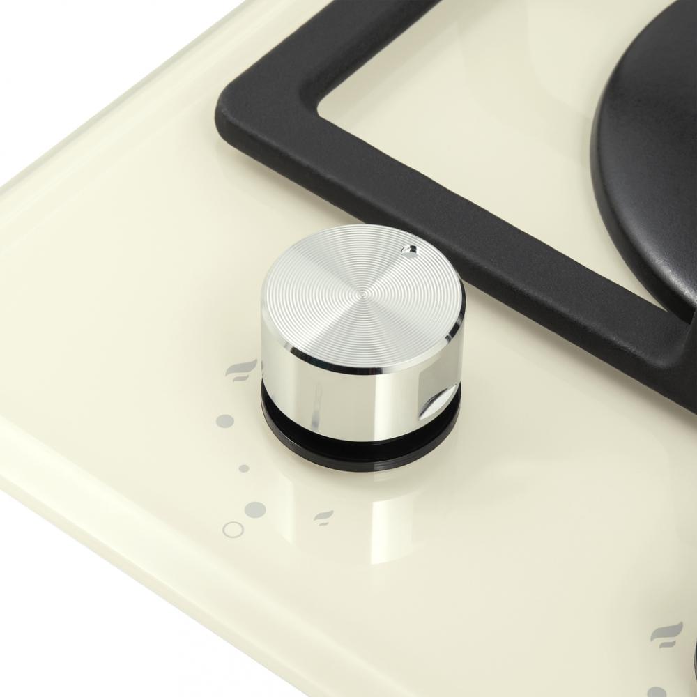Цвет — бежевый. Благодаря отсутствию рамки она отлично впишется в интерьер и не займет лишнее место на столешнице, которое можно использовать для работы. Открытый огонь не страшен ни вашей посуде, ни вам, так как горелки надежно закрыты решетками. Материал самой поверхности: закаленное стекло. Управление этой моделью механическое. Для переключения уровней нагрева, выбора функций используются следующие переключатели: поворотные. Простая система контроля за прибором делают его более универсальным, ведь разобраться сможет кто угодно.