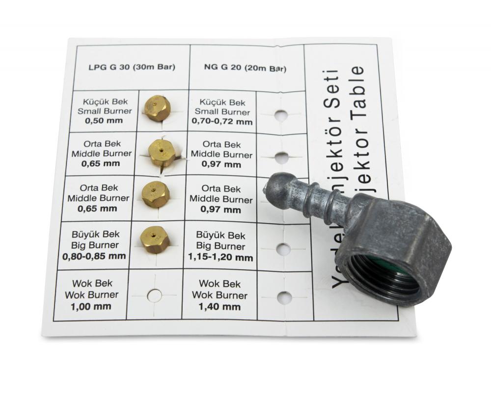 Для того, чтобы обеспечить безопасность при работе с баллонным газом, баллон подключается в варочной панели через форсунки, или жиклеры, — детали, предназначенные для распыления газовоздушной смеси. Жиклеры изготавливаются из латуни или бронзы и представляют собой болт с резьбой и отверстием в головке, через которое и подается газ — диаметр этого отверстия указывается на самом жиклере. Этот размер определяется давлением газа и характеристиками варочной панели, поэтому необходимо использовать жиклер, подходящий исключительно для данной модели. Как правило, диаметр отверстия и другие параметры можно найти и в инструкции пользователя.