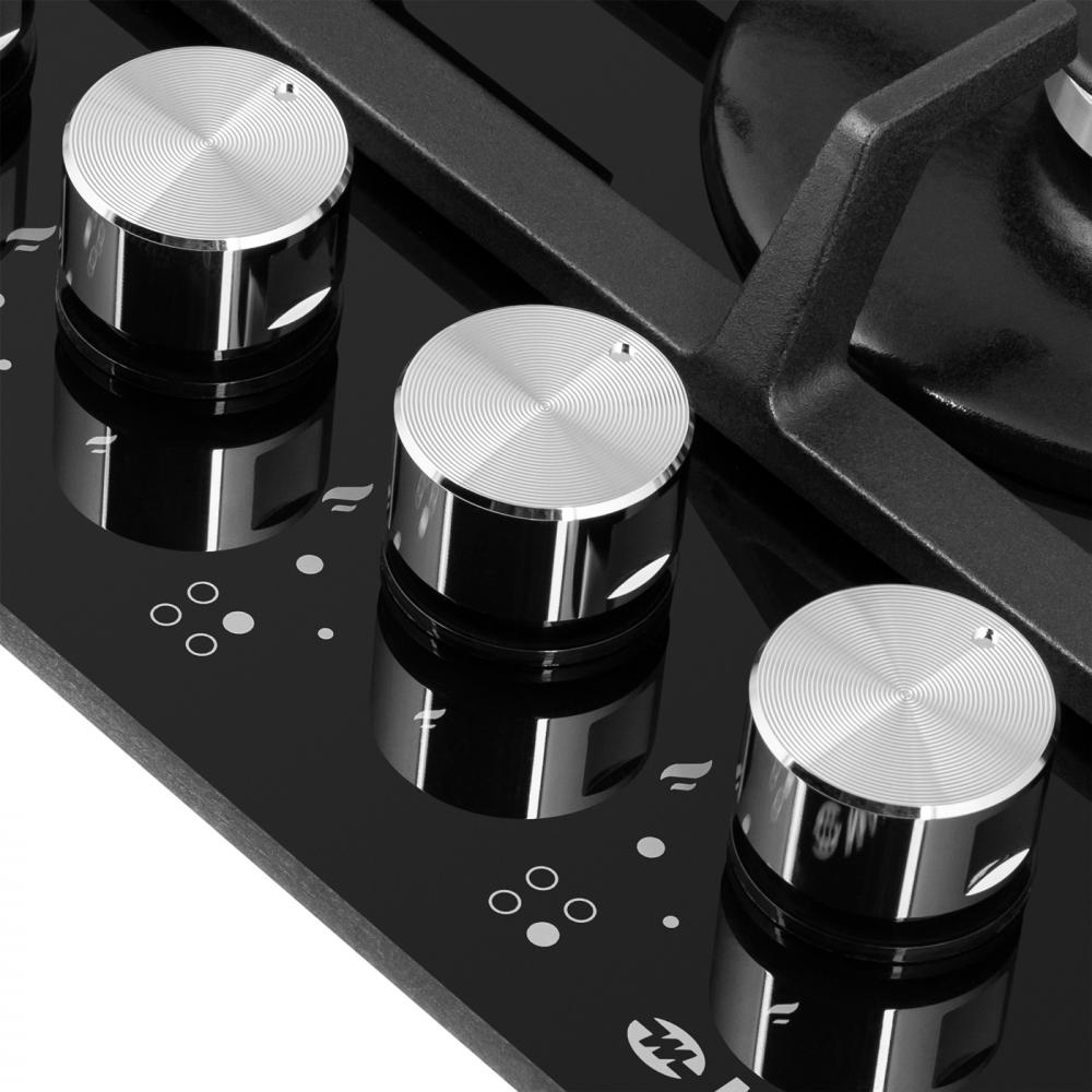 Цвет — черный. Благодаря отсутствию рамки она отлично впишется в интерьер и не займет лишнее место на столешнице, которое можно использовать для работы. Открытый огонь не страшен ни вашей посуде, ни вам, так как горелки надежно закрыты решетками. Материал самой поверхности: закаленное стекло. Управление этой моделью механическое. Для переключения уровней нагрева, выбора функций используются следующие переключатели: поворотные. Простая система контроля за прибором делают его более универсальным, ведь разобраться сможет кто угодно.