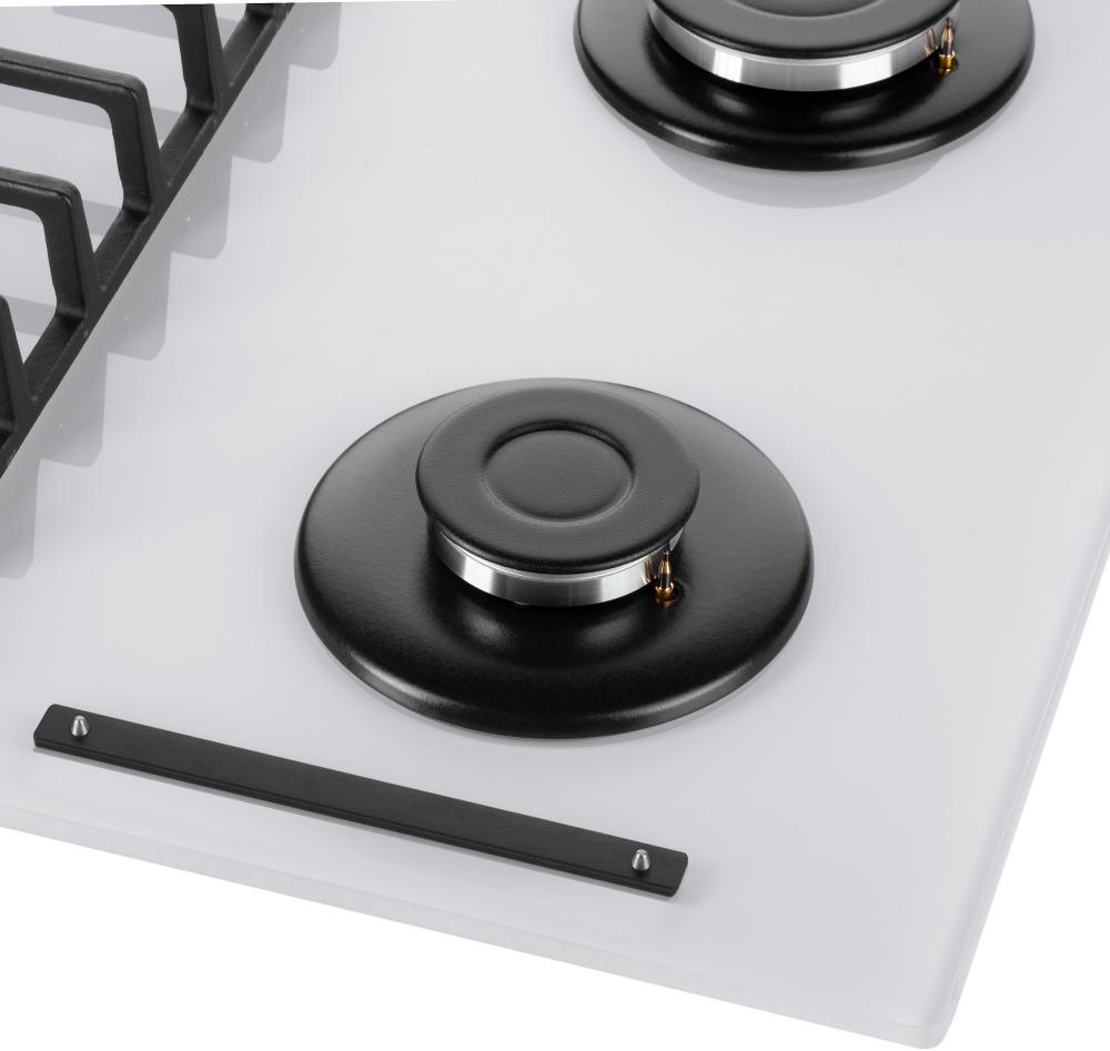 Цвет — белый. Благодаря отсутствию рамки она отлично впишется в интерьер и не займет лишнее место на столешнице, которое можно использовать для работы. Открытый огонь не страшен ни вашей посуде, ни вам, так как горелки надежно закрыты решетками. Материал самой поверхности: закаленное стекло. Управление этой моделью механическое. Для переключения уровней нагрева, выбора функций используются следующие переключатели: поворотные. Простая система контроля за прибором делают его более универсальным, ведь разобраться сможет кто угодно.