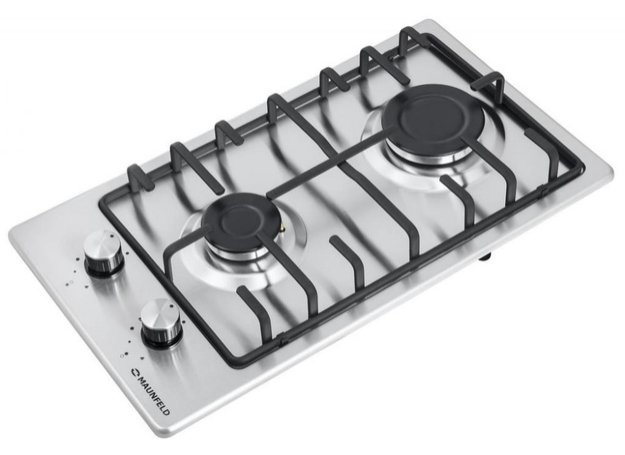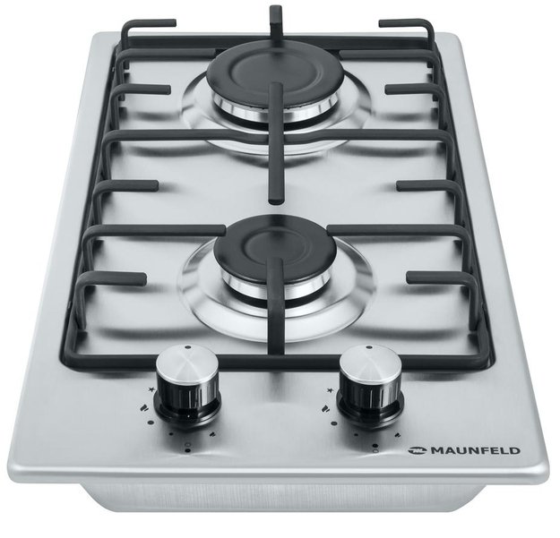 Maunfeld EGHS.32.3ES — газовая варочная панель шириной всего 29 см с двумя конфорками. Ее особенность — четыре ножки-опоры, которые позволяют использовать ее двумя способами: как настольную и как встраиваемую. Поверхность изготовлена из нержавеющей стали, а устойчивая решетка для размещения посуды — из эмалированного металла. Для приготовления пищи служат конфорки SABAF — средняя и большая. Эти конфорки безопасны, экономичны и удобны в очистке благодаря матовым крышкам. Не нагревающиеся механические поворотные переключатели позволяют плавно регулировать интенсивность пламени.