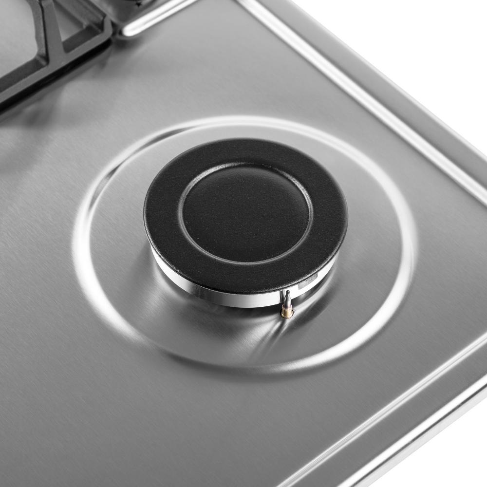 Выбор газовой варочной панели чаще всего обусловлен тем, что в частный дом или квартиру проведен именно газ в качестве обогрева. Работать с этой моделью довольно просто, так как мощность нагрева видна невооруженным взглядом — по силе огня в горелке. Количество конфорок в этой модели: 4.