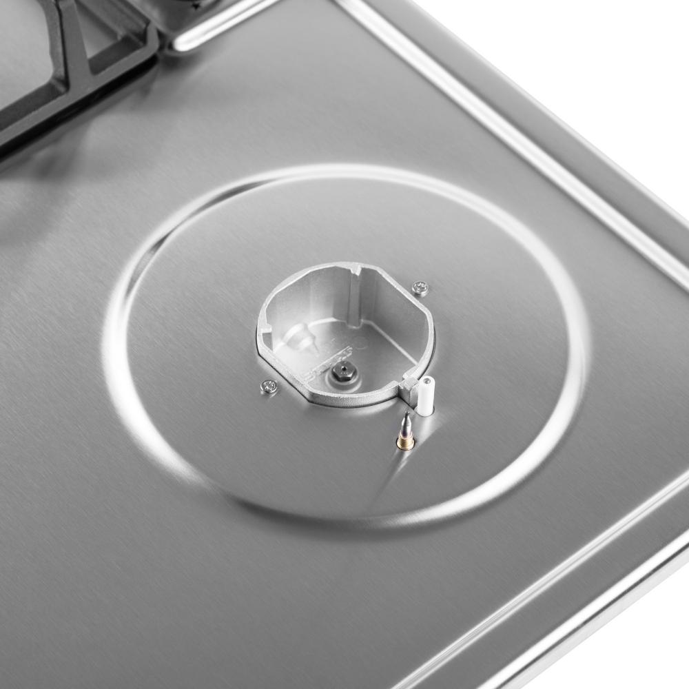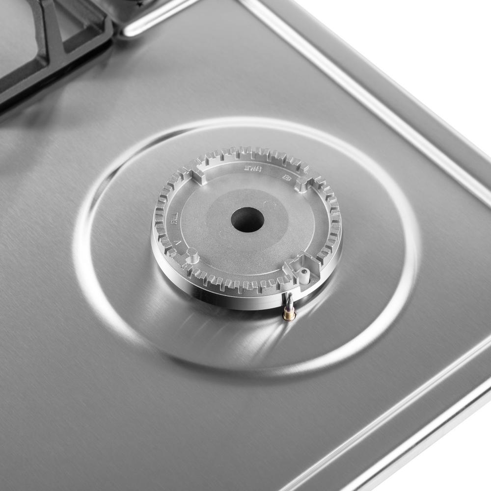 Цвет — нержавеющая сталь. Благодаря отсутствию рамки она отлично впишется в интерьер и не займет лишнее место на столешнице, которое можно использовать для работы. Открытый огонь не страшен ни вашей посуде, ни вам, так как горелки надежно закрыты решетками. Материал самой поверхности: нержавеющая сталь. Управление этой моделью механическое. Для переключения уровней нагрева, выбора функций используются следующие переключатели: поворотные. Простая система контроля за прибором делают его более универсальным, ведь разобраться сможет кто угодно.