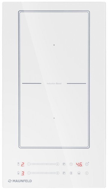Варочная панель работает на индукционном нагреве — это значит, что повышается температура непосредственно посуды, в которой готовится блюдо. Таким образом промежуточная ступень с предварительным нагревом конфорки пропускается — сокращается время, повышается безопасность. Количество конфорок в этой модели: 2.