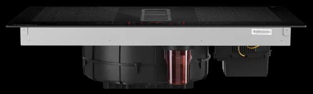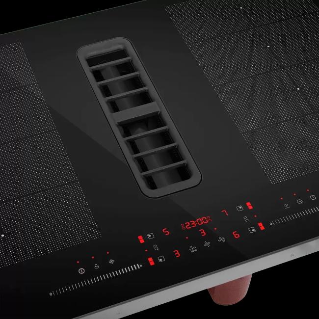 Вытяжка, встроенная в варочную панель — достаточно удобный вариант, позволяющий сэкономить место в кухне. Такая конструкция позволяет лучше улавливать испарения, не давая им распространяться по всему помещению, и способствует более качественной очистке воздуха. Большинство подобных моделей может работать только в режиме рециркуляции воздуха, с удалением капель жира, сажи, неприятных запахов при помощи системы фильтров. Работу в режиме отвода загрязненного воздуха через систему вентиляции организовать довольно сложно, поскольку вытяжка располагается низко над полом. Часто варочная панель находится на кухонном острове, что также мешает присоединению к вентиляции. Еще одна особенность подобных моделей состоит в том, что под варочной панелью нельзя разместить духовку или другую технику, так как место будет занято.