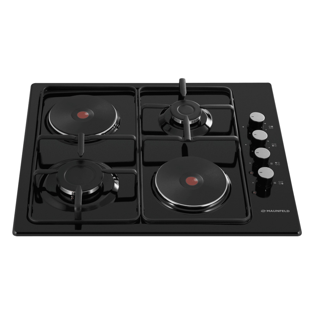 Maunfeld EEHE.64.5EB/KG — оригинальная комбинированная варочная панель с двумя газовыми и двумя электрическими конфорками. Благодаря ширине 60 см она может быть установлена в кухне любой площади. Итальянские горелки SABAF с электроподжигом дополнены раздельными эмалированными решетками. Чугунные конфорки HP RAPID мощностью по 1500 Вт обеспечивают стабильный нагрев. Поверхность изготовлена из черной эмалированной стали, удобной в очистке. Для регулировки мощности нагрева предусмотрена боковая панель управления с не нагревающимися механическими поворотными переключателями.