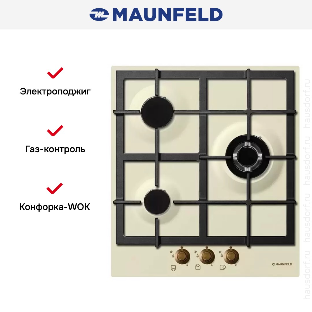 Maunfeld MGHE.43.71RIB — бежевая варочная панель в классическом дизайне. Модель снабжена тремя итальянскими горелками SABAF с системой автоматического электроподжига. Для размещения посуды предусмотрены прочные чугунные решетки. Благодаря компактному размеру, панель можно устанавливать в небольших кухнях.