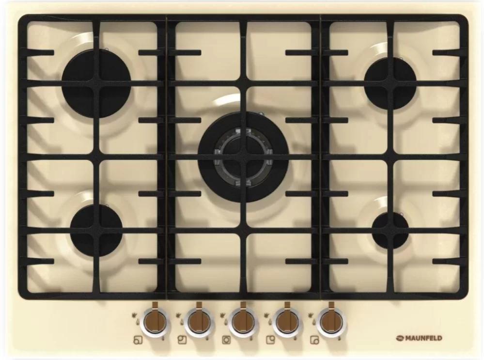 Maunfeld MGHE.75.78RIB — бежевая варочная поверхность с эмалированной панелью конфорок. Модель снабжена пятью разноразмерными конфорками, одна из которых имеет три ряда пламени. Во избежание взрыво- и пожароопасных ситуаций предусмотрена система газового контроля. Автоматический электроподжиг позволяет управлять функционалом устройства одной рукой.
