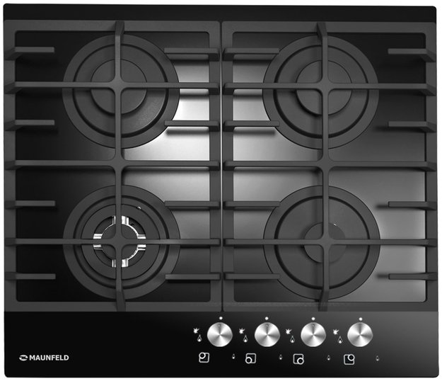 Maunfeld MGHG.64.17B — практичная варочная поверхность в черном цвете. Стеклянная панель конфорок со скошенным переднем краем дополнена чугунными решетками для размещения посуды и цельнометалическими регуляторами интенсивности пламени. Для удобства эксплуатации предусмотрена система автоматического электроподжига.