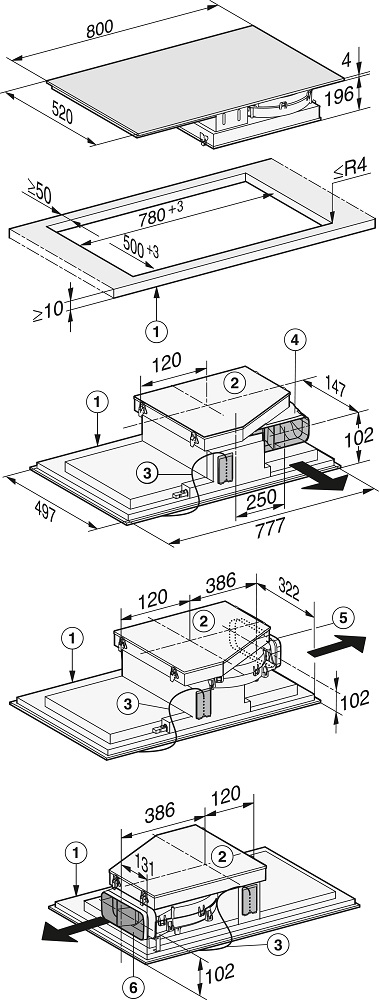 Вытяжка, встроенная в варочную панель — достаточно удобный вариант, позволяющий сэкономить место в кухне. Такая конструкция позволяет лучше улавливать испарения, не давая им распространяться по всему помещению, и способствует более качественной очистке воздуха. Большинство подобных моделей может работать только в режиме рециркуляции воздуха, с удалением капель жира, сажи, неприятных запахов при помощи системы фильтров. Работу в режиме отвода загрязненного воздуха через систему вентиляции организовать довольно сложно, поскольку вытяжка располагается низко над полом. Часто варочная панель находится на кухонном острове, что также мешает присоединению к вентиляции. Еще одна особенность подобных моделей состоит в том, что под варочной панелью нельзя разместить духовку или другую технику, так как место будет занято.