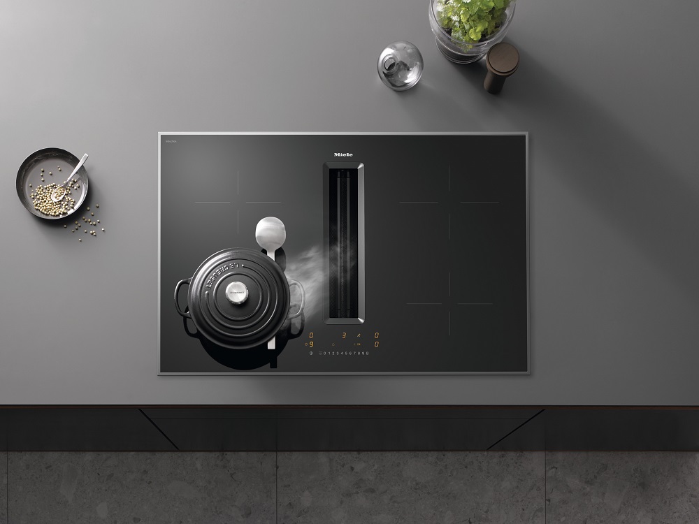 Вытяжка, встроенная в варочную панель — достаточно удобный вариант, позволяющий сэкономить место в кухне. Такая конструкция позволяет лучше улавливать испарения, не давая им распространяться по всему помещению, и способствует более качественной очистке воздуха. Большинство подобных моделей может работать только в режиме рециркуляции воздуха, с удалением капель жира, сажи, неприятных запахов при помощи системы фильтров. Работу в режиме отвода загрязненного воздуха через систему вентиляции организовать довольно сложно, поскольку вытяжка располагается низко над полом. Часто варочная панель находится на кухонном острове, что также мешает присоединению к вентиляции. Еще одна особенность подобных моделей состоит в том, что под варочной панелью нельзя разместить духовку или другую технику, так как место будет занято.