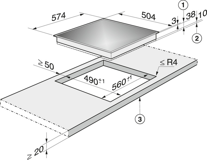 Отверстие в нише выполняют, исходя из размеров самой варочной панели — они должны соответствовать друг другу либо немного превышать размеры выреза. При выборе наиболее распространенной варочной панели с 4 конфорками в столешнице вырезается отверстие шириной 59 см и глубиной около 49-50 см. Толщина столешницы должна быть немного меньше, чем высота варочной панели, в противном случае панель придется заглубить, чтобы она не слишком выступала.