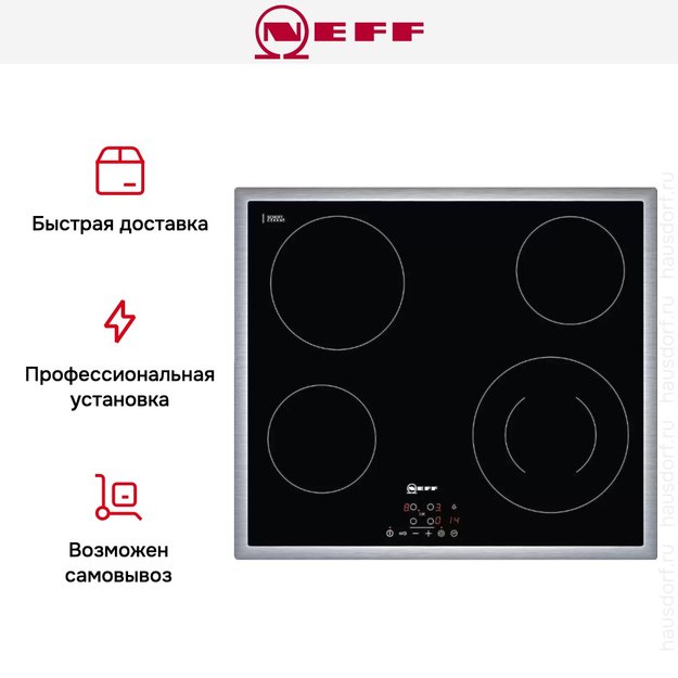 Neff T13B41N2 — независимая варочная панель шириной 60 см. Модель снабжена четырьмя зонами нагрева Hi-Light, одна из которых имеет круглый контур расширения. Защитное отключение и возможность блокировки элементов управления гарантируют безопасную эксплуатацию устройства.