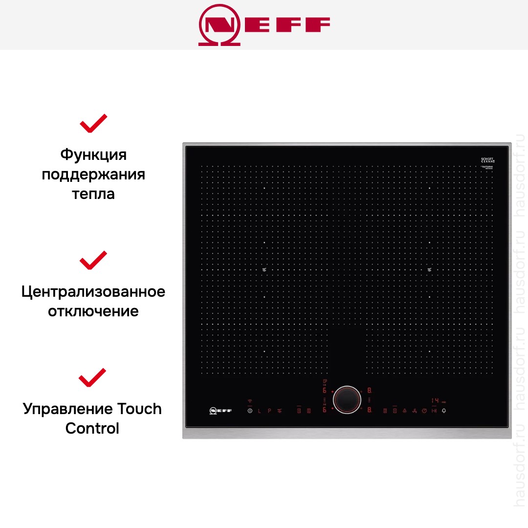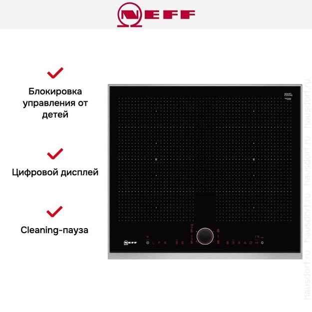 Варочная панель Neff T66TS6RN0 с независимым подключением и четырьмя индукционными зонами нагрева будет превосходно смотреться в современной кухне. Черная стеклокерамическая поверхность с рамкой Comfort из нержавеющей стали выглядит очень стильно благодаря оригинальной разметке зон нагрева. Устройство можно комбинировать с другими варочными поверхностями для создания индивидуальной рабочей зоны. Стекло легко очищается от загрязнений. При необходимости можно воспользоваться специальным скребком, который быстро удаляет лишнее.