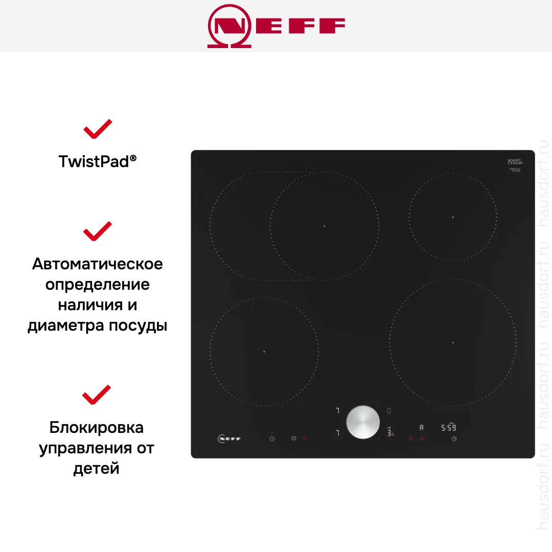 Цвет — черный. Благодаря отсутствию рамки она отлично впишется в интерьер и не займет лишнее место на столешнице, которое можно использовать для работы. Материал самой поверхности: стеклокерамика. Управление этой моделью электронное. Для переключения уровней нагрева, выбора функций используются следующие переключатели: сенсорные/TouchControl, TwistPad. Продвинутая система контроля за прибором делают его современным и отвечающим на главные запросы покупателя.