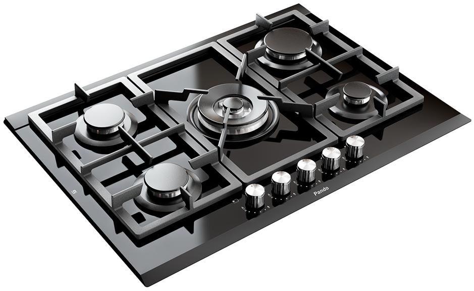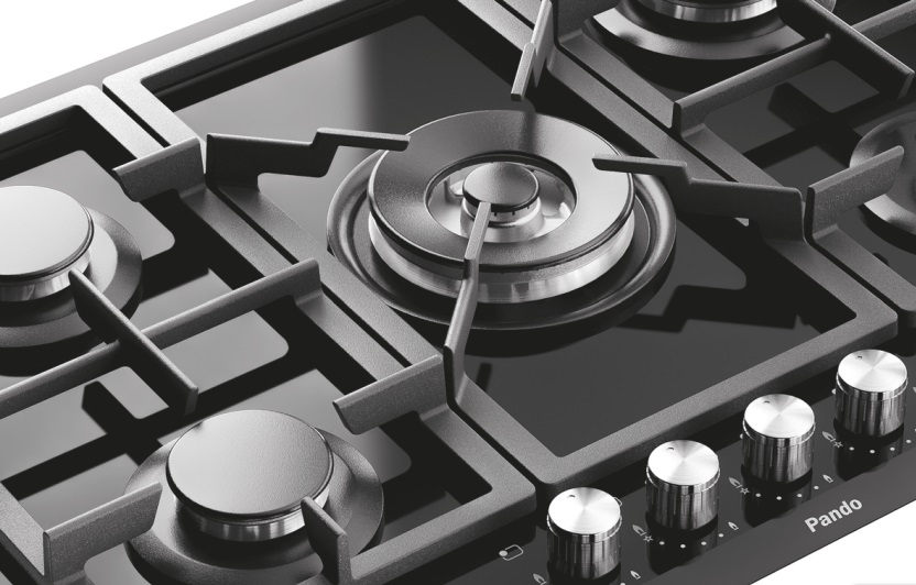 Выбор газовой варочной панели чаще всего обусловлен тем, что в частный дом или квартиру проведен именно газ в качестве обогрева. Работать с этой моделью довольно просто, так как мощность нагрева видна невооруженным взглядом — по силе огня в горелке. Количество конфорок в этой модели: 5. Горелки с тройной короной имеют несколько ступеней нагрева — в зависимости от них образуется несколько кругов пламени.