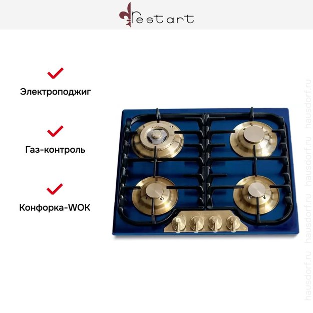 Restart ELP060 BU — элегантная модель с эмалированной рабочей поверхностью и латунной фурнитурой. Варочная панель оборудована четырьмя газовыми конфорками, среди которых «Тройная корона». Для безопасной эксплуатации прибора предусмотрена система защиты от топливной утечки, которая автоматически отключает внезапно затухшую горелку.