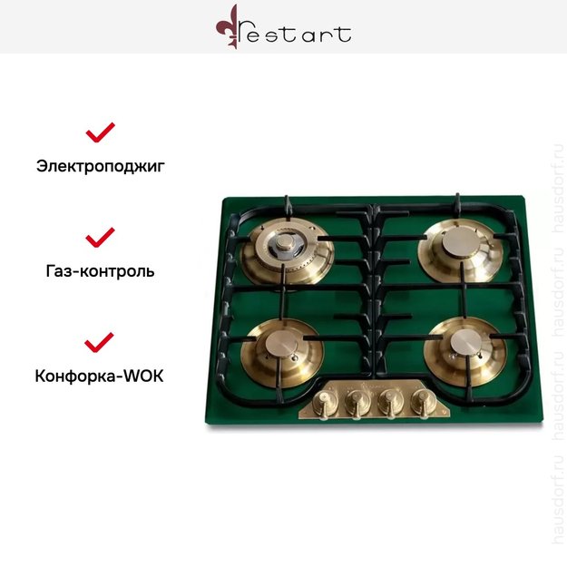 Restart ELP060 GN — независимая варочная панель шириной 58 см. Модель оборудована четырьмя разноразмерными конфорками, одна из которых имеет три ряда пламени. Для защиты от топливной утечки предусмотрена надежная технология контроля газа.
