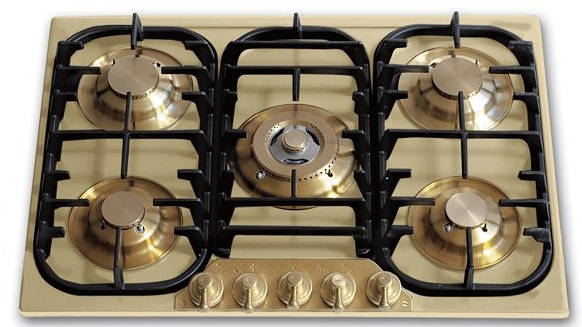 Реже выпускаются панели других оттенков — коричневого, красного, оранжевого, зеленого, цвета меди, фиолетового, бордо — их достаточно трудно сочетать с кухонными гарнитурами и бытовыми приборами. Газовые варочные панели необычных оттенков нередко оснащаются и оригинальной медной, бронзовой или латунной фурнитурой в стиле ретро. Любители цветных варочных панелей могут обратить внимание на продукцию Smeg, Kuppersberg, Kaiser, Ilve, Franke и ряда других производителей.