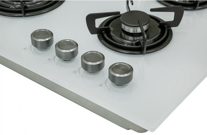 Цвет — белый. Благодаря отсутствию рамки она отлично впишется в интерьер и не займет лишнее место на столешнице, которое можно использовать для работы. Открытый огонь не страшен ни вашей посуде, ни вам, так как горелки надежно закрыты решетками. Материал самой поверхности: закаленное стекло. Управление этой моделью механическое. Для переключения уровней нагрева, выбора функций используются следующие переключатели: поворотные. Простая система контроля за прибором делают его более универсальным, ведь разобраться сможет кто угодно.
