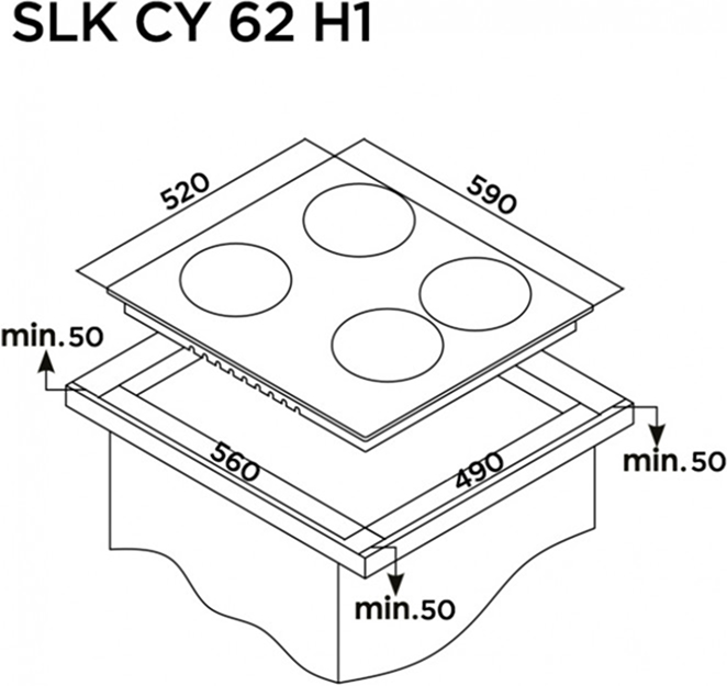 Отверстие в нише выполняют, исходя из размеров самой варочной панели — они должны соответствовать друг другу либо немного превышать размеры выреза. При выборе наиболее распространенной варочной панели с 4 конфорками в столешнице вырезается отверстие шириной 59 см и глубиной около 49-50 см. Толщина столешницы должна быть немного меньше, чем высота варочной панели, в противном случае панель придется заглубить, чтобы она не слишком выступала.
