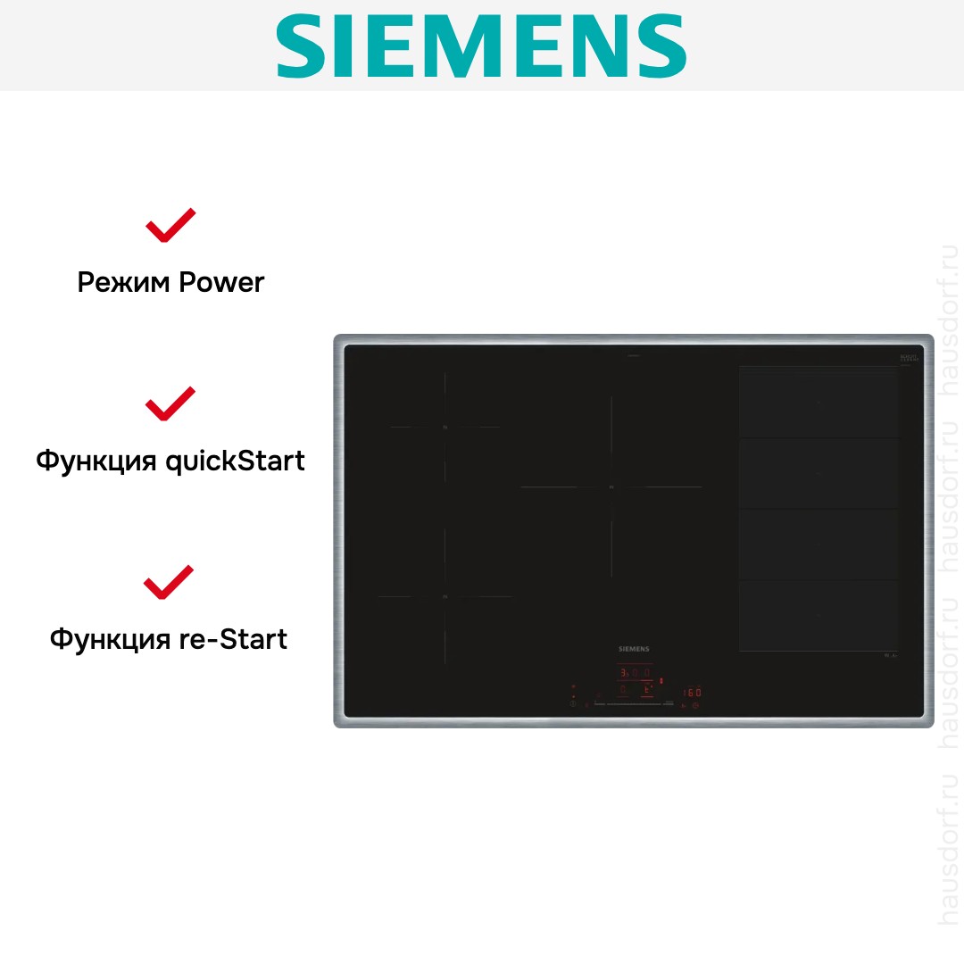Благодаря функции QuickStart место на поверхности, где установлена посуда, определяется автоматически. Пользователю не нужно выбирать конфорку нажатием соответствующей кнопки: чтобы начать приготовление, ему достаточно только поставить кастрюлю или сковороду на поверхность и выбрать температуру — варочная панель при этом начнет нагревать соответствующую конфорку самостоятельно. При этом требуется использовать посуду исключительно из намагничивающихся материалов — таких, как нержавеющая или эмалированная сталь.