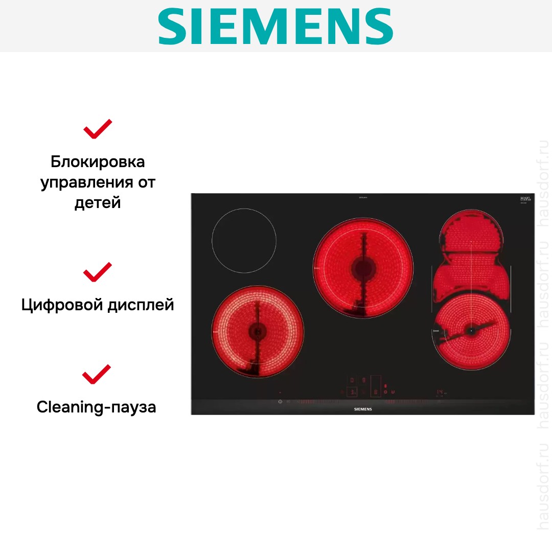 Siemens ET875LMP1D — независимая варочная поверхность с пятью электрическими конфорками типа Hi-Light. Индикация остаточного тепла наглядно отображает, какая конфорка еще не остыла, чтобы использовать ее для подогрева готовых блюд. Функционал прибора расширяют таймер с автоматикой отключения и режим cleaning-паузы.