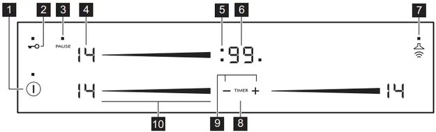 Для каждой конфорки предусмотрен также индикатор уровня мощности: он показывает, какова интенсивность нагрева в конкретный момент. Если в данной модели имеется таймер, специальный индикатор указывает, сколько времени осталось до окончания приготовления или прошло с начала работы, дополнительно может также выдаваться сообщение о том, включен ли звуковой сигнал. Индикаторы активации различных опций могут оповещать о включении режимов оттаивания, подогрева, об активации функции паузы, автоматики жарения и закипания, функции временного увеличения мощности, о блокировке панели управления от детей.