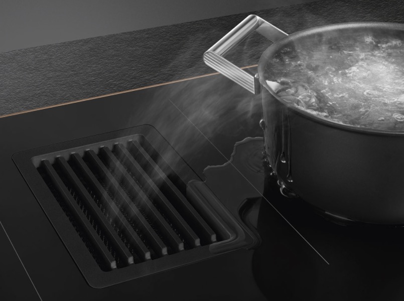Вытяжка, встроенная в варочную панель — достаточно удобный вариант, позволяющий сэкономить место в кухне. Такая конструкция позволяет лучше улавливать испарения, не давая им распространяться по всему помещению, и способствует более качественной очистке воздуха. Большинство подобных моделей может работать только в режиме рециркуляции воздуха, с удалением капель жира, сажи, неприятных запахов при помощи системы фильтров. Работу в режиме отвода загрязненного воздуха через систему вентиляции организовать довольно сложно, поскольку вытяжка располагается низко над полом. Часто варочная панель находится на кухонном острове, что также мешает присоединению к вентиляции. Еще одна особенность подобных моделей состоит в том, что под варочной панелью нельзя разместить духовку или другую технику, так как место будет занято.
