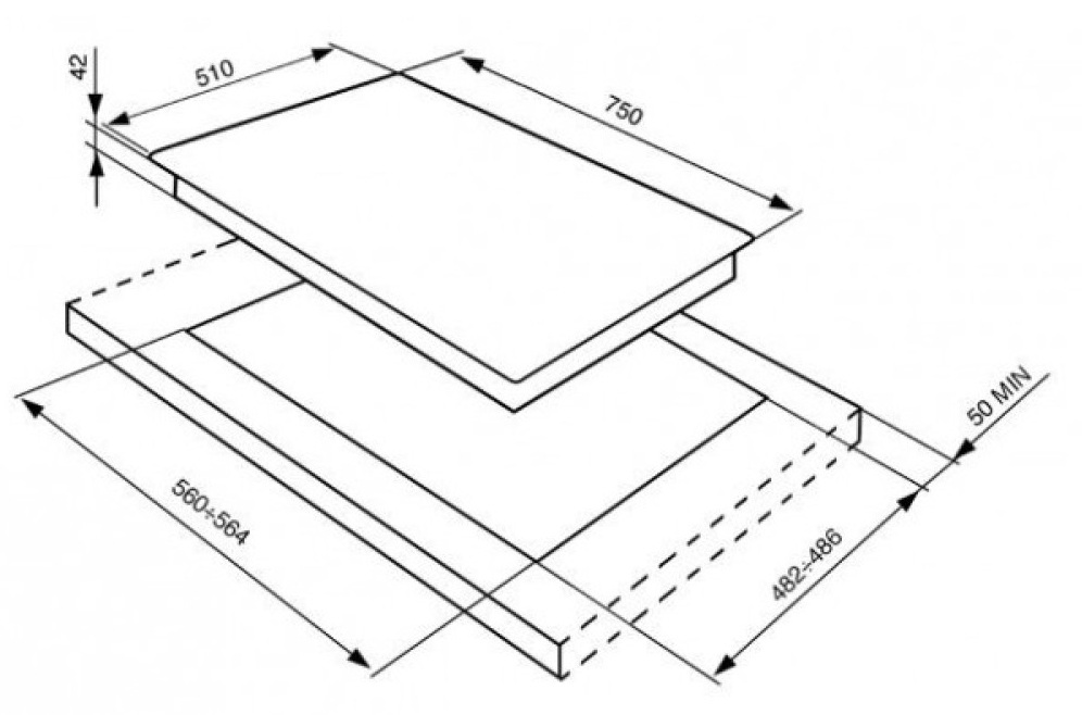 Отверстие в нише выполняют, исходя из размеров самой варочной панели — они должны соответствовать друг другу либо немного превышать размеры выреза. При выборе наиболее распространенной варочной панели с 4 конфорками в столешнице вырезается отверстие шириной 59 см и глубиной около 49-50 см. Толщина столешницы должна быть немного меньше, чем высота варочной панели, в противном случае панель придется заглубить, чтобы она не слишком выступала.