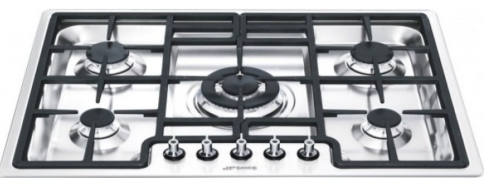 Для каждой конфорки предусмотрена своя ручка управления. Графическое обозначение помогает пользователю быстро сориентироваться в настройках для определенной конфорки. Центральное положение занимает самая мощная конфорка, оснащенная двумя рядами пламени, контурами которой можно управлять раздельно. Она обеспечивает быстрое доведение до кипения жидкости, а также позволяет экспериментировать с блюдами, которые необходимо готовить в посуде wok. Среди преимуществ: газ-контроль, автоматический электроподжиг, жиклеры для сжиженного газа в комплекте.