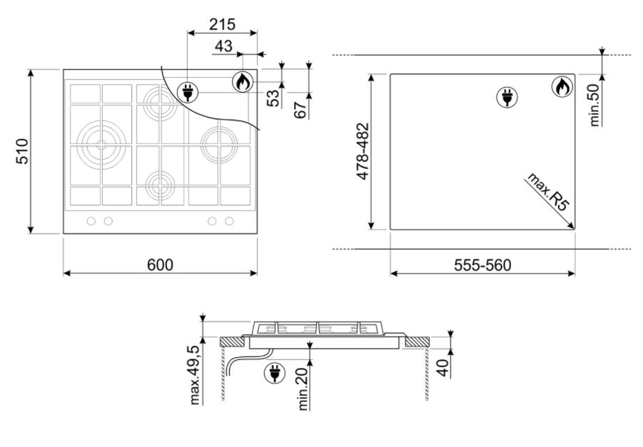 Отверстие в нише выполняют, исходя из размеров самой варочной панели — они должны соответствовать друг другу либо немного превышать размеры выреза. При выборе наиболее распространенной варочной панели с 4 конфорками в столешнице вырезается отверстие шириной 59 см и глубиной около 49-50 см. Толщина столешницы должна быть немного меньше, чем высота варочной панели, в противном случае панель придется заглубить, чтобы она не слишком выступала.