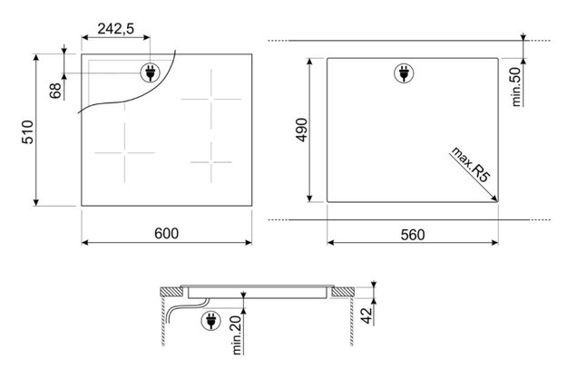 Отверстие в нише выполняют, исходя из размеров самой варочной панели — они должны соответствовать друг другу либо немного превышать размеры выреза. При выборе наиболее распространенной варочной панели с 4 конфорками в столешнице вырезается отверстие шириной 59 см и глубиной около 49-50 см. Толщина столешницы должна быть немного меньше, чем высота варочной панели, в противном случае панель придется заглубить, чтобы она не слишком выступала.