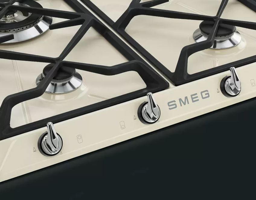 Smeg SR964PGH — независимая варочная поверхность в элегантном кремовом исполнении. Эмалированная панель конфорок дополнена чугунными решетками для посуды, прочными и простыми в уходе. Автоматический электроподжиг позволяет активировать горелки одной рукой. Газ-контроль исключает риск утечки. При затухании пламени, например, из-за сквозняка или в случае залива, прибор блокирует подачу газа через несколько секунд, что повышает безопасность эксплуатации.