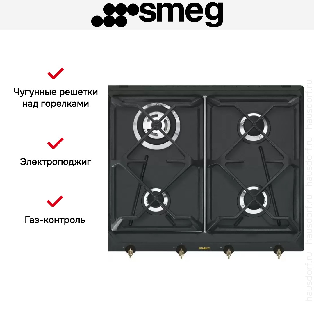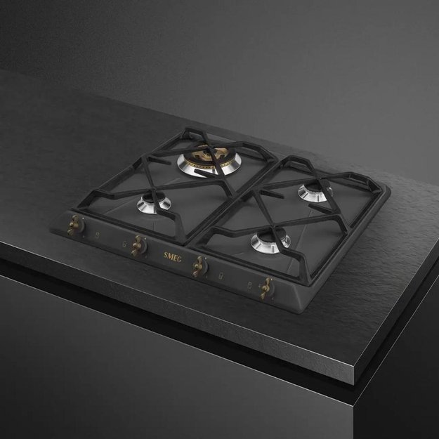 Smeg SRV864AOGH — газовая варочная поверхность в элегантном антрацитовом цвете. Модель дополнена прочными чугунными решетками и изящной латунной фурнитурой. Автоматический электроподжиг гарантирует комфортную эксплуатацию прибора, предоставляя возможность активировать необходимую конфорку одним поворотом соответствующей ручки-регулятора. Для подключения опции требуется присоединение устройства к электросети.