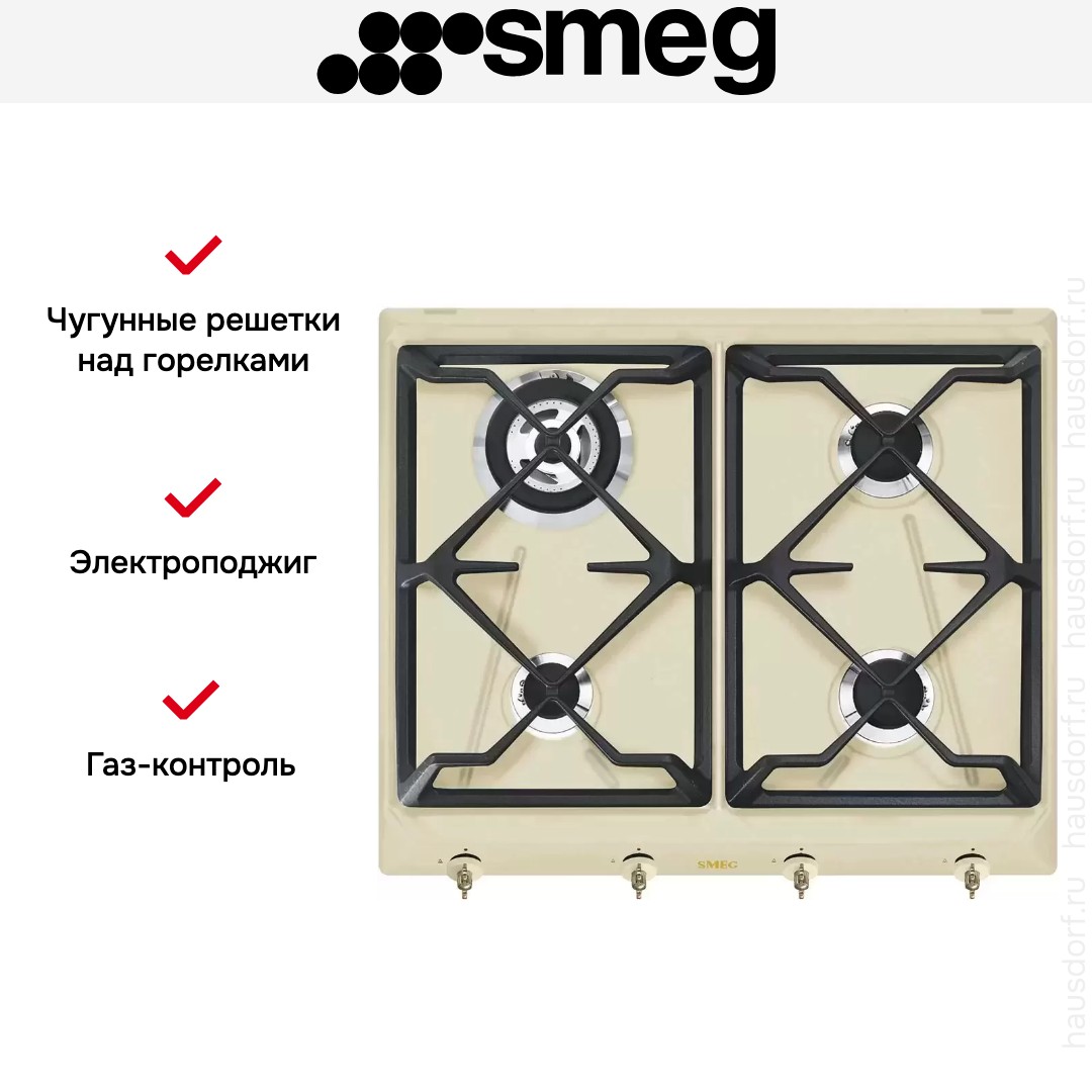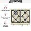 Smeg SRV864POGH — элегантная варочная поверхность в кремовом цвете. Для приготовления пищи доступно четыре газовые конфорки, одна из которых повышенной мощности — 3.3 кВт. Эргономичные чугунные решетки позволяют легко разместить как емкости с небольшим диаметром дна, так и крупную посуду. Это возможно за счет нестандартной конструкции. Перекрещивающиеся элементы располагаются непосредственно над горелками, когда в обычных вариантах предусматривается свободная от решеток зона. Таким образом, посуда даже с самым маленьким диаметром, например, турка, не будет сваливаться на бок, обеспечивая качественные результаты приготовления. Держатели снимаются для очистки. Разбивка на две части делает процесс обслуживания быстрым и удобным.